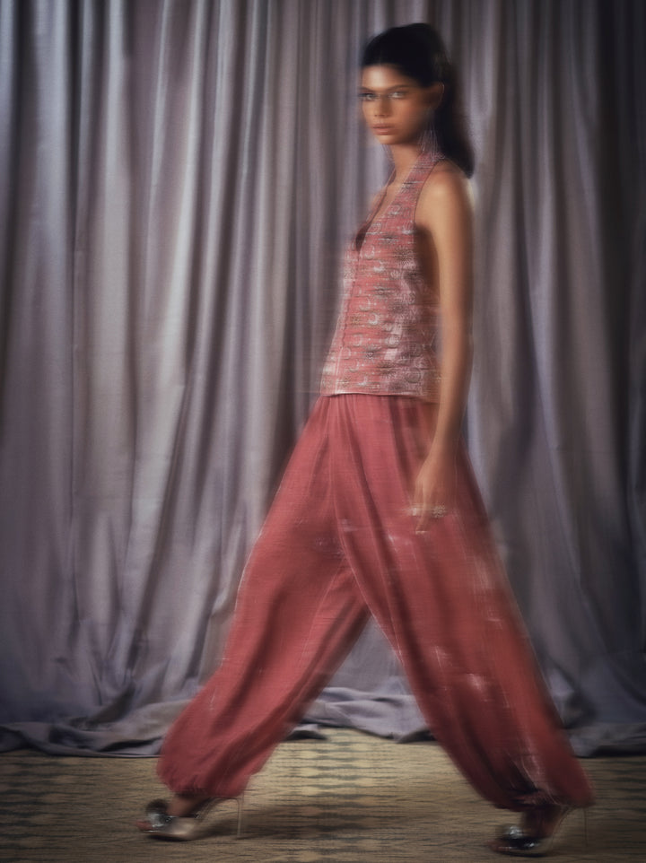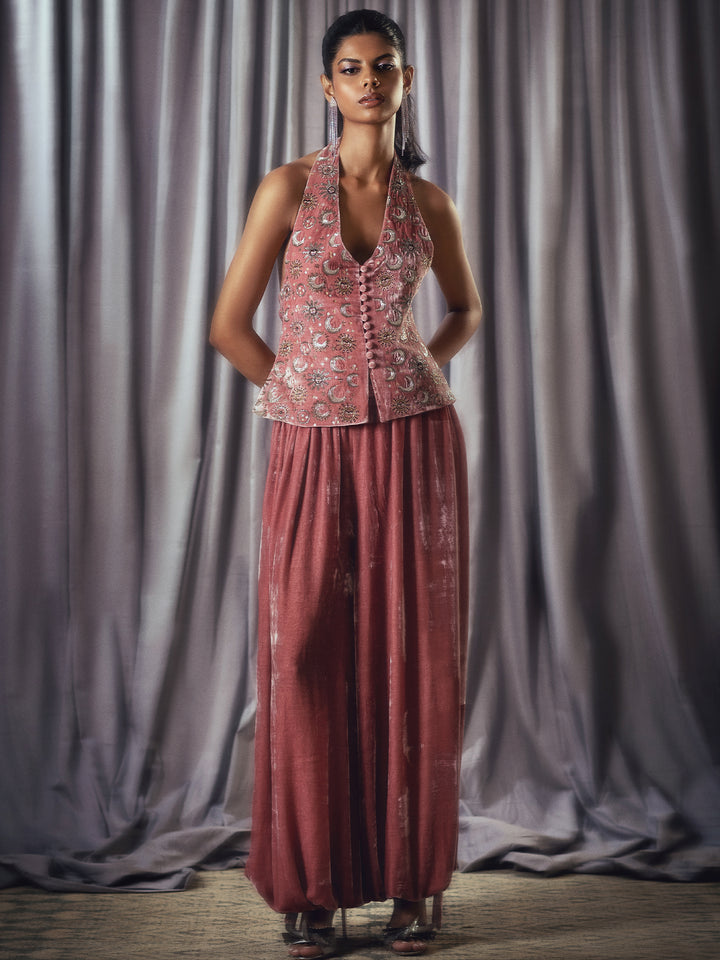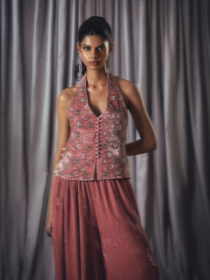 A flesh pink handworked halter vest containing crescent motifs paired with velvet pants.