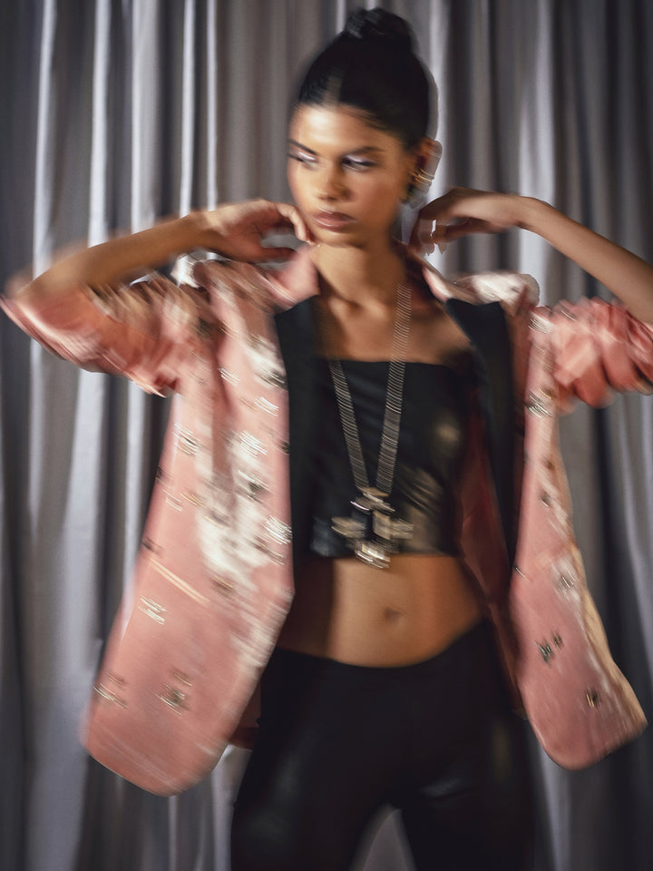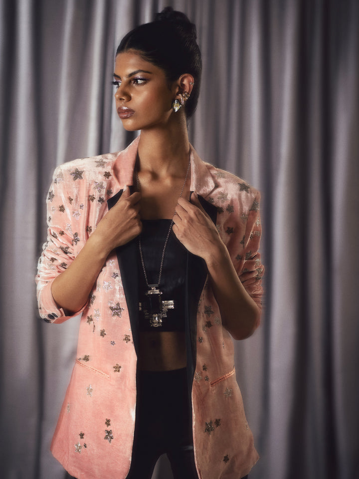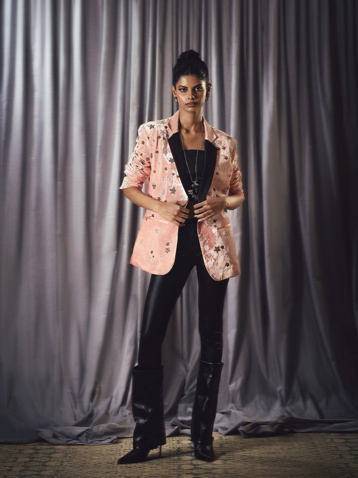 A salmon pink velvet blazer with black lapels ornamented with classic star motifs.