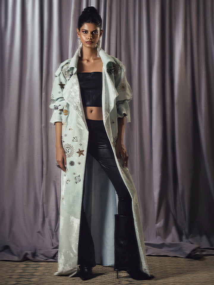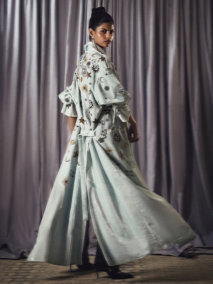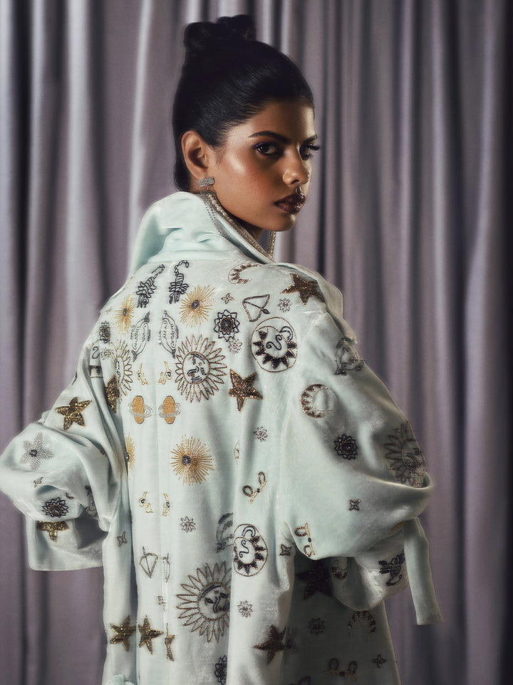 A powder blue velvet trench-coat ornamented with horoscope and planet motifs.