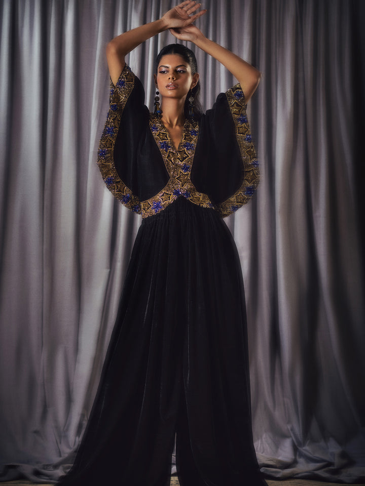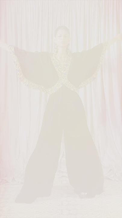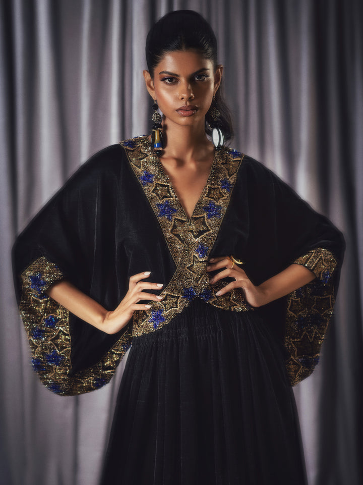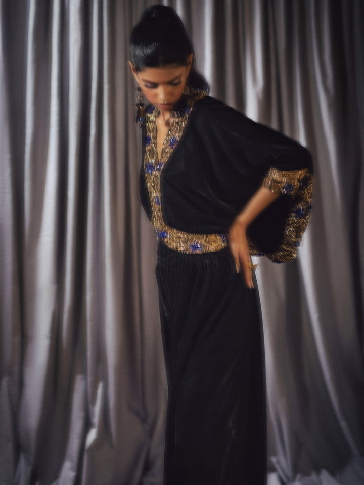A black velvet jumpsuit with flare, ornamented with statement, starry detailing.